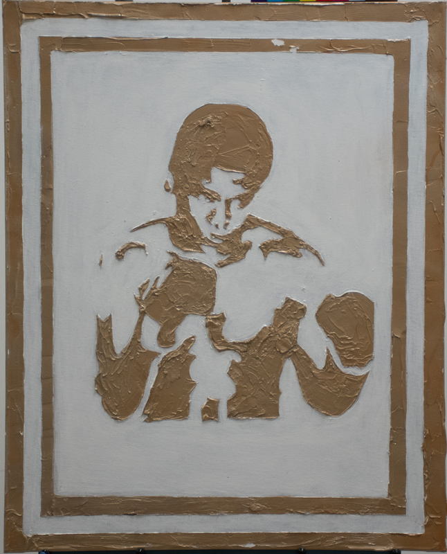 Morris’ painting is a golden portrait of boxer Muhammad Ali raising his fists and preparing for a strike. The painting is inspired by a photograph taken in the 1960s at the height of his athletic career. Ali gained acclaim, controversy, and celebrity not just for his boxing achievements, but also for his conversion to Islam, civil rights activism, and refusal to fight in the Vietnam War.