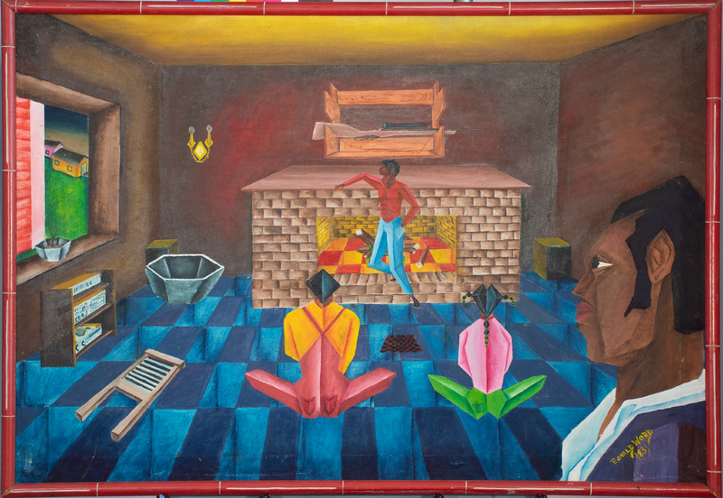 Word’s painting is a partial pre-study of his Hannah Hall mural. The painting, featuring a family in a small room with a fireplace, washboard, mounted gun, and radio, is done in a geometric style frequently seen in the art of Biggers’ students from the late 1970s and early 1980s. Word’s full mural design includes adjacent panels depicting a church, an abstract figure with a bubble-like head, and an homage to the Wizard of Oz.