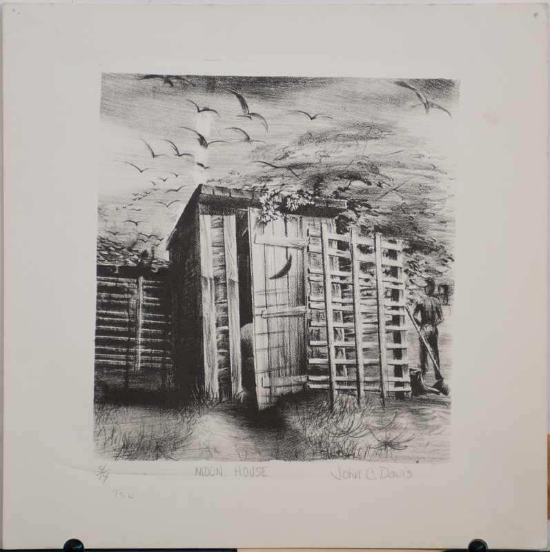 Davis’s print is of an outhouse, colloquially referred to as a moon house. In modern imagination, the crescent moon on an outhouse door has become an identifying symbol of frontier living. Davis’ print also shows a shirtless man zipping up his pants upon exiting the outhouse, while a huge flock of birds fly overhead.
