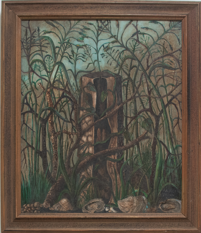Ellison's painting is a nature scene featuring a bisected tree stump, with untamed growth all around it. At the bottom of the painting, there are several seashells, which the artist enhanced with raised, textural elements. Ellison graduated from Texas Southern University in 1972.