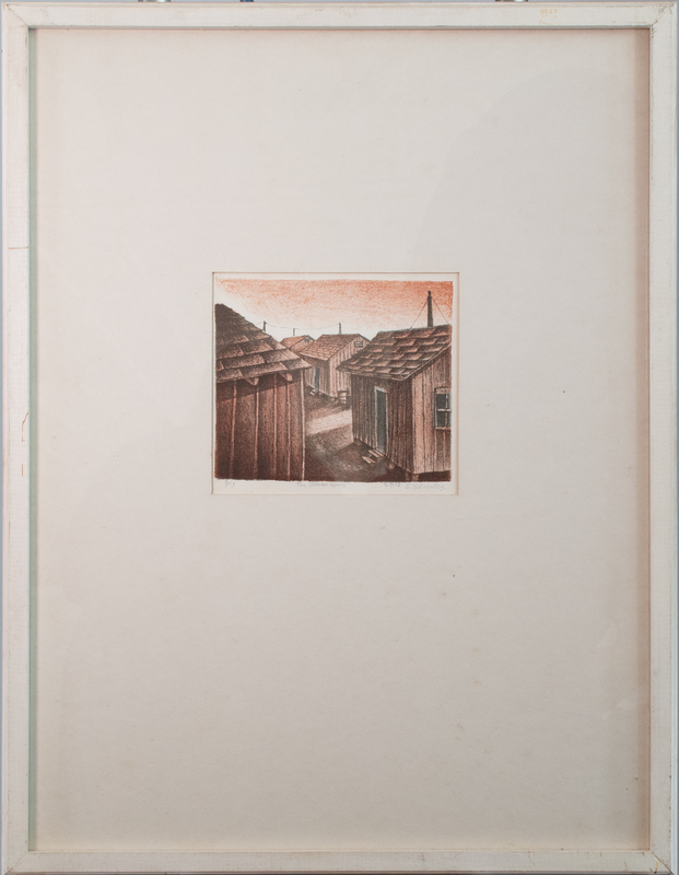 Sifuentes’ print shows a series of shotgun houses. The composition portrays Oleander Homes, a public housing complex in Galveston, Texas, the artist's hometown. The complex was destroyed by Hurricane Ike in 2008 and was rebuilt and reopened in September 2024. Shotgun houses and urban environments are common settings for Texas Southern student artworks.