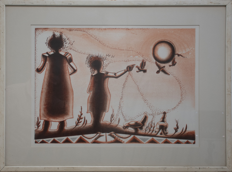 This print by Bennie Settles shows a mother and child standing in a field and feeding chickens and other birds. Settles' illustration of seeds is reminiscent of the way John Biggers paints seeds in his mural "Web of Life." Settles' work can be recognized by the power imbued in his careful portrayal of Black hair.