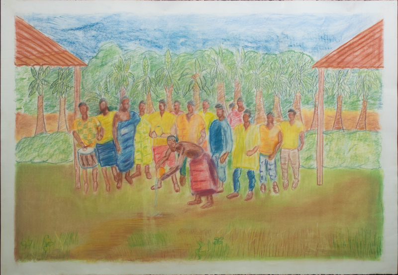 The work shows a group gathering for a libation ceremony in a field; as one member is pouring water into the ground, the other members are playing musical instruments. A libation ceremony is when liquid is poured into the ground as an offering to and in remembrance of a deceased loved one. This ceremony is practiced across the African diaspora.