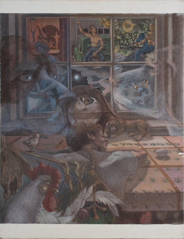 Samples' painting is a study of his mural created in Hannah Hall. The design unfolds like a dream, with each panel above the central figure (the artist himself), who is asleep on a table, revealing a constellation of scenes from the artists’ youth. Lower window panels evoke a harmonious existence with nature and animals, while upper panels reveal struggles with racism in the South and his mother’s death. The shadowy dogs along the sides of the study were not included in the final mural.
