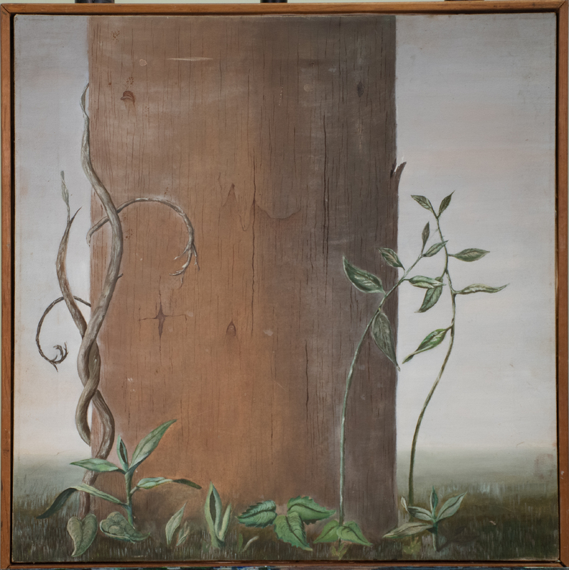 This painting, created by an unknown TSU art student, depicts the base of a tree or wooden telephone pole, with various smaller plants and vines creeping up its structure. Dr. John T. Biggers encouraged students to study the natural world and seek inspiration from it. He instructed students to sit outside for an extended period of time and observe.