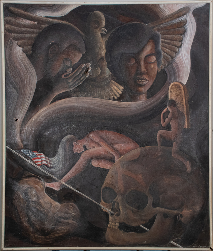 Ellison’s painting reflects the brutality and grief experienced by the Black community. In the foreground, a skull is pierced by the American flag. On the right side, a headstone honoring Martin Luther King, Jr. is surrounded by nude mourners. In the background, a shadowy dove spreads its wings, perhaps representing MLK’s dream of peace being obscured by white supremacist violence.