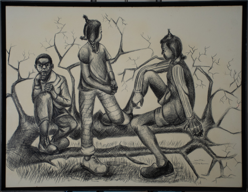 Tinker’s drawing shows three children lounging around a fallen tree. The two girls are depicted with elongated limbs, and the rightmost girl also has oversized hands. Dr. Biggers influenced his students to draw the hands and feet of their subjects in great detail and disproportionately large. This style continues to be taught to and implemented in the works of TSU artists in the 21st century.