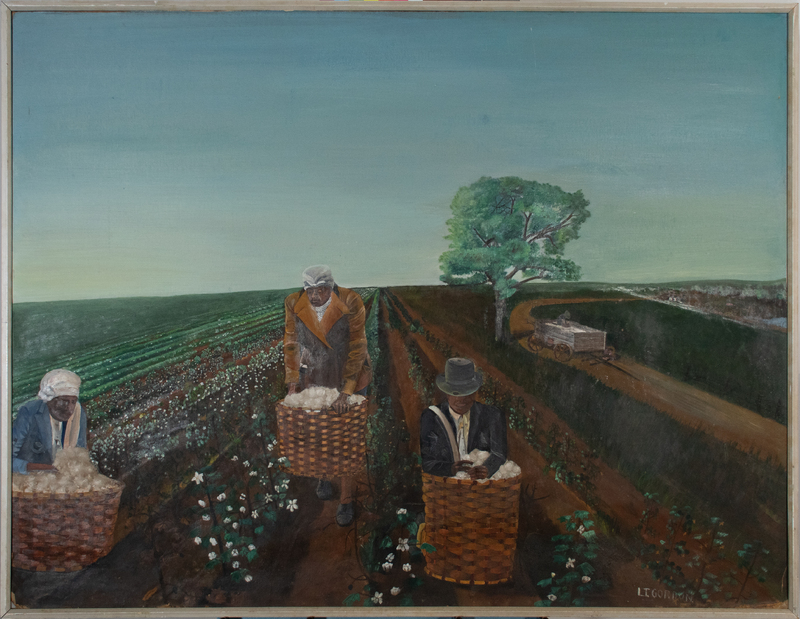 Gordon's painting reflects the work life of cotton harvesters. The three pictured laborers are older and formally dressed as they pick cotton bolls and carry baskets. Many of the cotton plants are shown with white flowers, an early stage in the plant’s development. This suggests Gordon may be familiar with the process of cotton farming and harvesting.