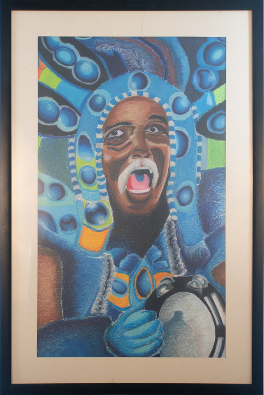 Remble's drawing portrays renowned Mardi Gras Indian chief David Montana. Mardi Gras Indians refers to Black New Orleanians who draw from Creole, Indigenous, African, and Afro-Caribbean tradition to develop a unique form of visual culture and resistance. Remble, a Texas Southern graduate, was born in New Orleans and later moved to Houston. In his own words, he aims to "explore and preserve the diverse subcultures of the American South" through his art.
