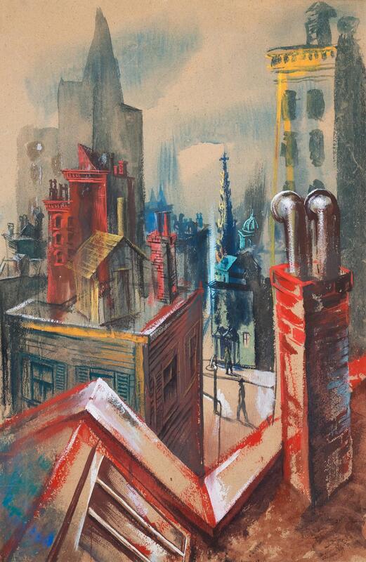 John Woodrow Wilson was a sculptor, painter, printmaker, and educator from Roxbury, MA. Roxbury Rooftops depicts an urbanscape from the perspective of the rooftops. The buildings closest to the viewer are shown in hues of red, orange, and yellow. Buildings further away are more brown, green, and gray.