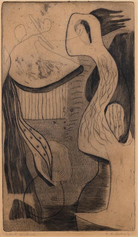 Hayward Oubre was a multimedia artist and educator from New Orleans, LA. His etching Silent Sentinel, created during his MFA at the University of Iowa, reflects his interrogation of social realism and cultural symbology.