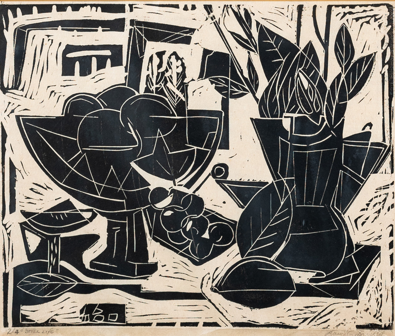 David Driskell was a Black artist, scholar, and curator known for his fusion of African abstract forms and modern aesthetics. Still Life is an abstract print of inanimate kitchen objects. It features a bowl of fruit, plates of food, vases of flowers, and other objects atop a table.