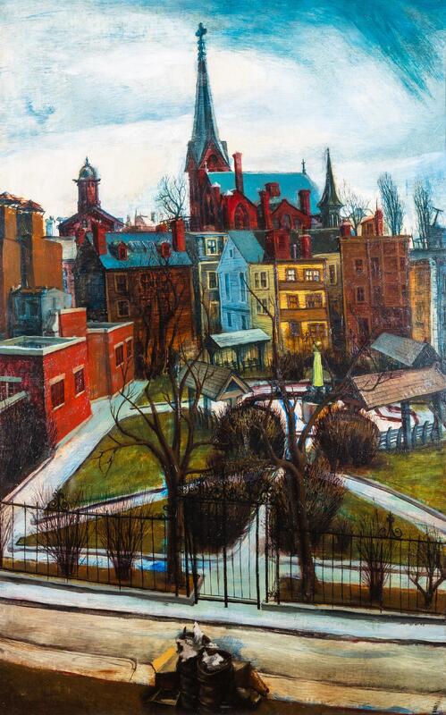 John Woodrow Wilson, a sculptor, painter, and printmaker from Roxbury, MA, was known for his creative portraits and stylistic approach to social justice. Roxbury Landscape shows a gated park under a blue, white, and yellow sky. Behind other buildings, there is a tall church and a courtyard with bare trees, depicting Autumn in Wilson’s hometown.