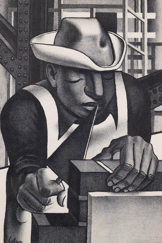 John Woodrow Wilson was a sculptor, painter, printmaker, and educator from Roxbury, MA. Trabajador is a black-and-white depiction of a Black bricklayer working at a construction site. The bricklayer is wearing a ten-gallon hat and overalls and holding bricks as he uses a trowel. There are steel beams in the background.