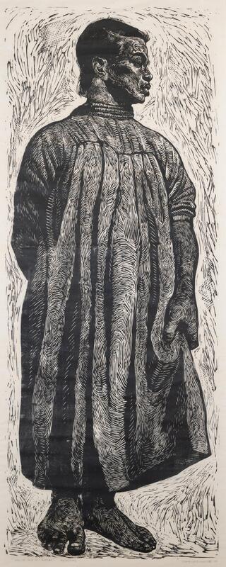 Charles White was a painter, printmaker, muralist, and educator known for his stylistic approach to African American subjects from Chicago, IL. Solid as a Rock is a print of the profile of a robed Black man. The barefoot man is holding on to his robe with his left and hides his right hand.