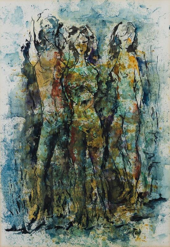 William S. Carter was an abstract, landscape, still-life, and figurative painter from St. Louis, Missouri. Three Women (figures) depicts three nude women drawn over muted watercolors. The women maintain a confident pose that separates them from their abstract background.