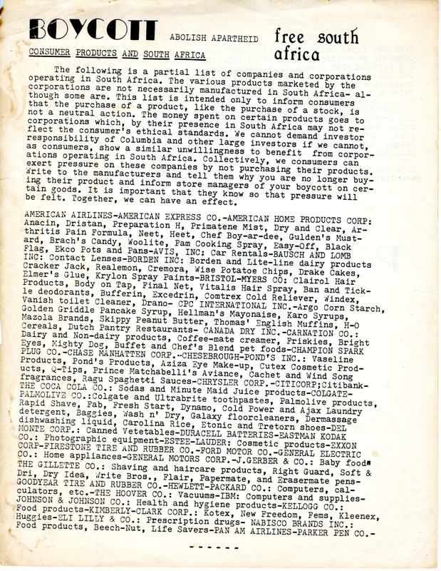 A list of companies doing business in South Africa. The memo suggests that people boycott these companies because of apartheid, South Africa’s institutionalized system of racial segregation that lasted from 1948 until the early 1990s. The memo also suggests for people to write to the companies and speak to store managers about the boycott.