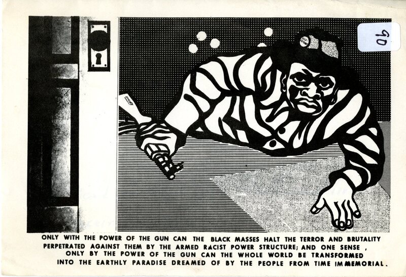 A card from fellow Black revolutionary and friend of Frankye Adams-Johnson (Malika), Curtis. The front of the card is a depiction of a man with a gun and text explaining that only through the gun can freedom be realized by the Black people. On the back of the card he writes “We send you this with revolutionary love and concern, Curtis.”