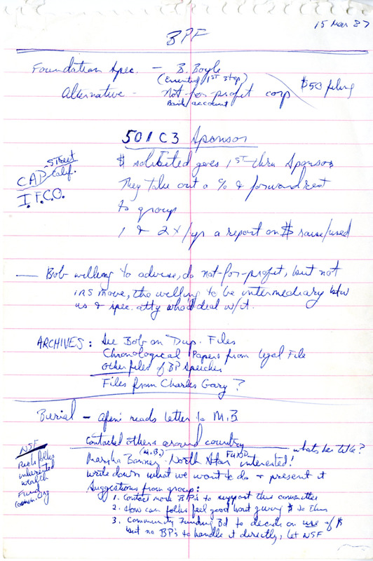Handwritten notes of minutes from a March 17, 1987 meeting of the Black Panther Foundation. The meeting covered such topics as sponsors for the foundation, archives, burial, prisoners of war, speakers bureau, leadership, and criticisms.