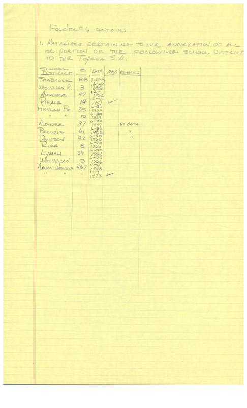 Case Data and Exhibits for Brown III, a relitigation of Brown v. Topeka Board of Education (1954) that corrected resegregation issues caused by open enrollment school choice in 1992. A 1984 ACLU memo titled "Topeka Trip #3” about the racial makeup of different Topeka communities. Annexation data, map legend, and notes by William Lamson.