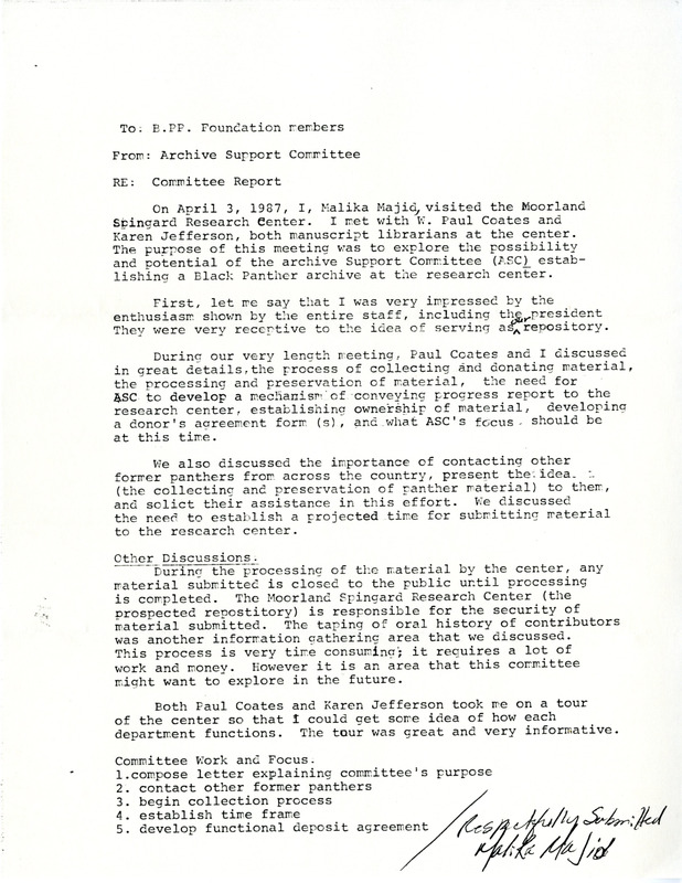 A committee report from Frankye Adams-Johnson (Malika) of the Archive Support Committee to the members of the Black Panther Party Foundation.The report gives details about her visit to the Moorland Spingarn Research Center on April 3, 1987. She met with the manuscript librarians there about the possibility of establishing a Black Panther Archive.