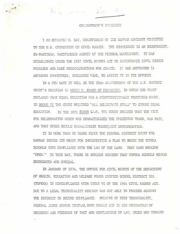 Case Data and Exhibits for Brown III, a relitigation of Brown v. Topeka Board of Education (1954) that corrected resegregation issues caused by open enrollment school choice in 1992. The report encourages the U.S. Justice Department and United States Department of Health, Education, and Welfare to conduct an investigation into Topeka Schools.