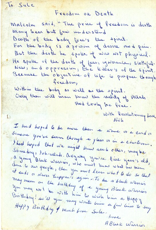 A birthday card from Nuh Abdul Qaiyum, who is imprisoned, to Sule for his 5th birthday. A photo of Malcolm X is on the cover. Nuh Abdul Qaiyum quotes Malcolm X and explains the importance of letting go of fear, ignorance, and oppression. He expresses disappointment that he is not free to wish Sule, “young Black warrior,” a happy birthday in person.