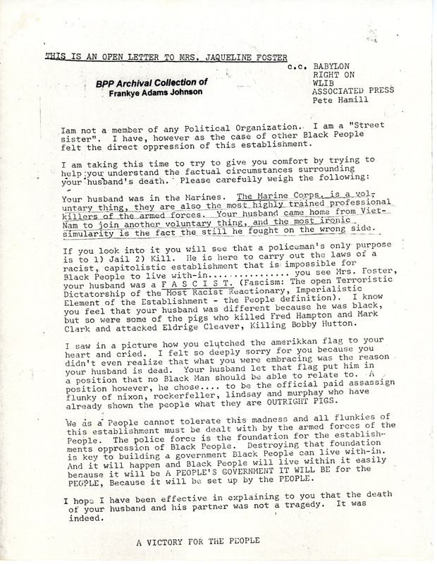 A letter to Jacqueline Foster, whose husband was recently killed in the line of duty as a police officer. The author writes that the officer, even though he was Black, was fighting on the side of the “racist, capitolistic (sic) establishment” and therefore his death was not a tragedy but “it was indeed a victory for the people.”