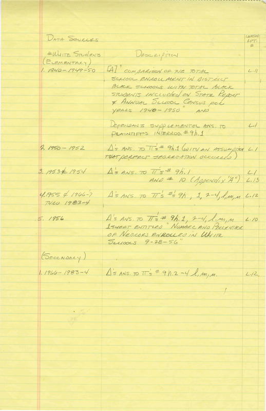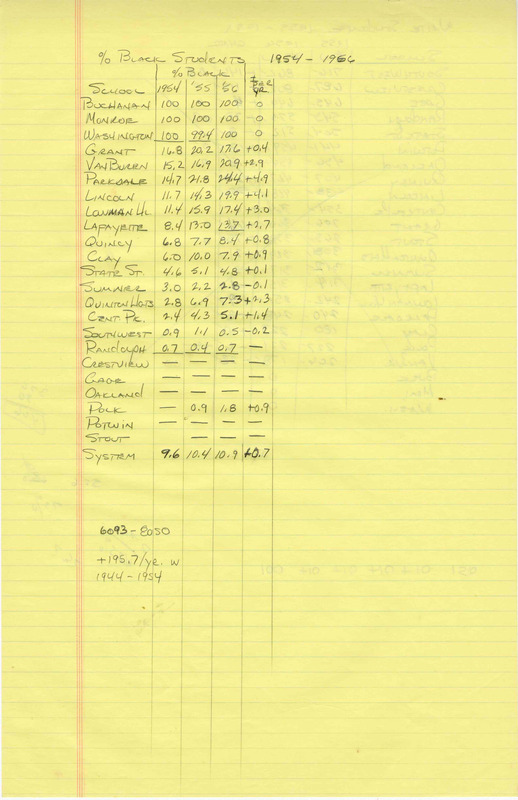 Case Data and Exhibits for Brown III, a relitigation of Brown v. Topeka Board of Education (1954) that corrected resegregation issues caused by open enrollment school choice in 1992. Analysis (handwritten notes and spreadsheets by William Lamson) of numbers and percentages of Black students in Topeka Public Schools from 1950-1983.