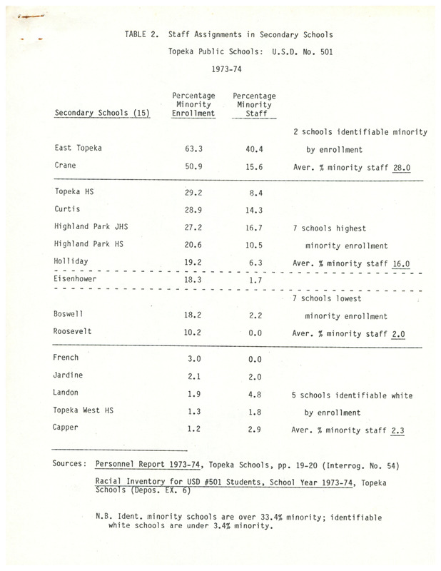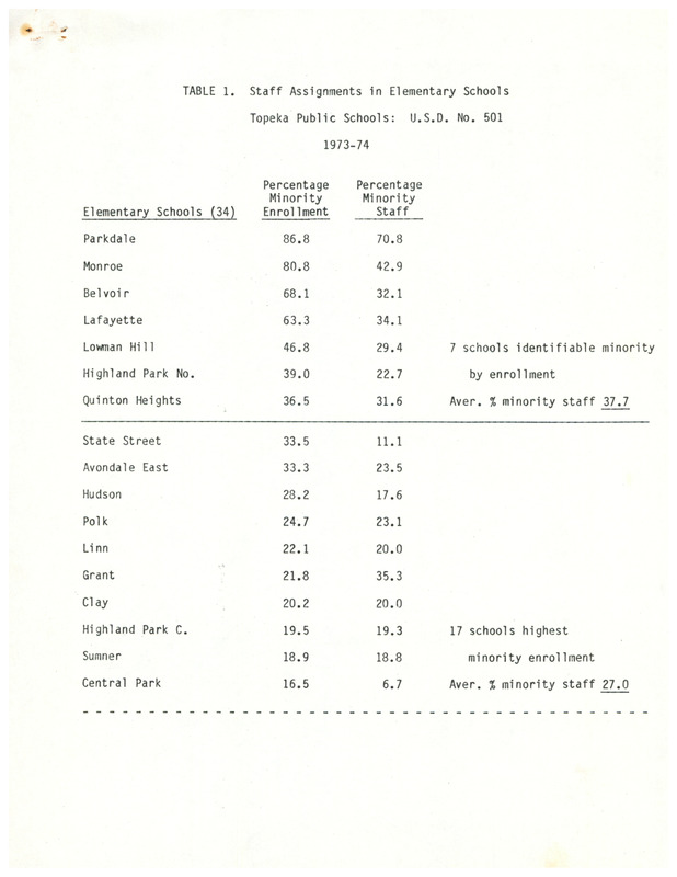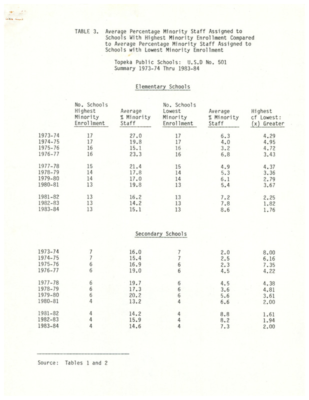 Case Data and Exhibits for Brown III, a relitigation of Brown v. Topeka Board of Education (1954) that corrected resegregation issues caused by open enrollment school choice in 1992. Charts comparing percentages of minority students to minority staff members in Topeka, Kansas, schools from the 1973 to 1984 school years.