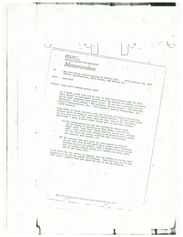 A United States Government Memorandum from Lynn Kirk to The Task Force members working in four different areas of Mississippi with the subject “Head Start funding ground rules.” The memo details how to save money so Head Start can operate with $30 million of a needed $39 million in funding without having to reduce the number of children served.
