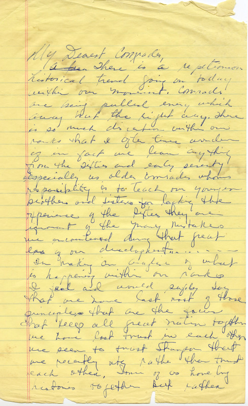“J”, a White movement leader, writes to “T” to apologize, explain, and take responsibility for past behavior that was in retaliation to the Black Liberation struggle. “J” explains the connection between sexism and racism. “J” acknowledges that Comrade “T” always understood the organization was wrong.