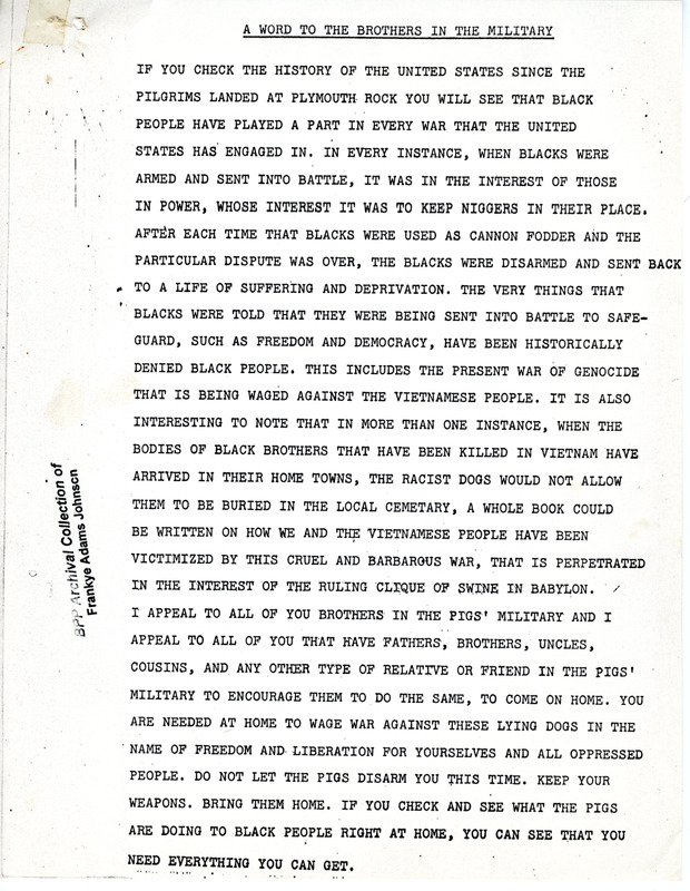 An essay encouraging Black members of the military to turn their weapons on their racist officers and come home with as many weapons as possible, like machine guns and grenades, for the liberation struggle. The author also suggests that the Black military members destroy machinery such as planes, tanks, helicopters, and ammunition dumps.