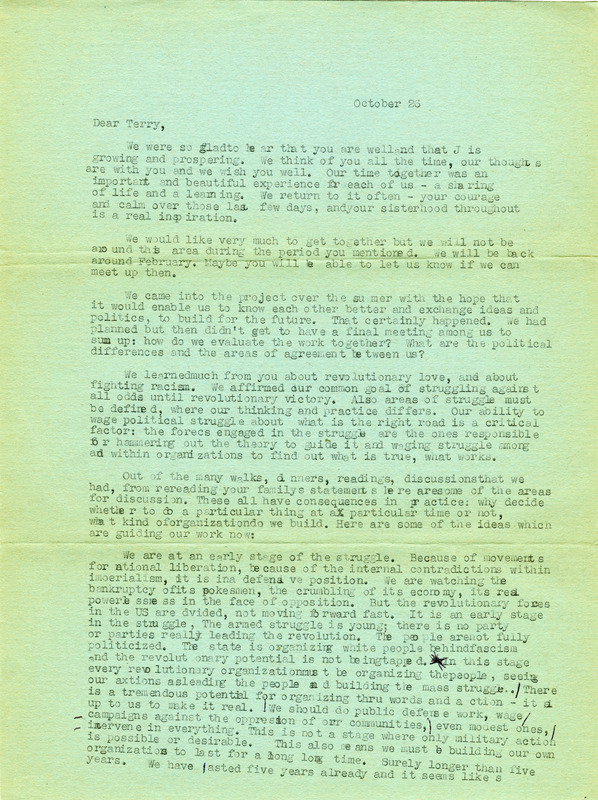 A letter from "M" to Terry. The author writes that it is the early days of the struggle and there is an opportunity to organize the people for revolutionary struggle, giving specific examples of work that can be done in communities to gain the support of the people. Tenets such as internationalism, organization, and Marxism-Leninism are discussed.