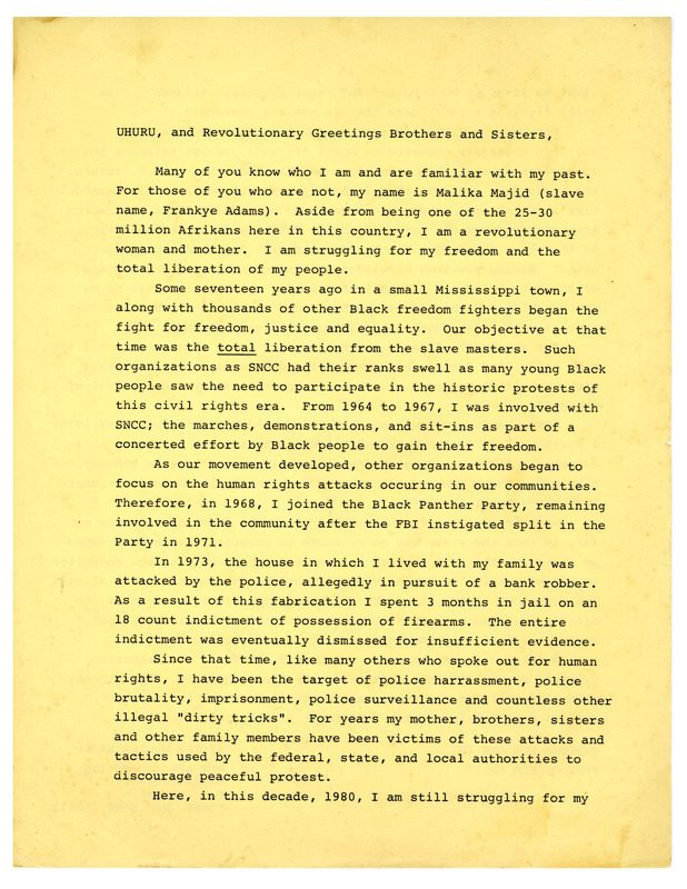 Frankye Adams Johnson (Malika) writes this letter to her supporters outlining the criminal charges she is facing in 1980 stemming from a 1974 arrest. She is asking for any support that may be given to her during this time.