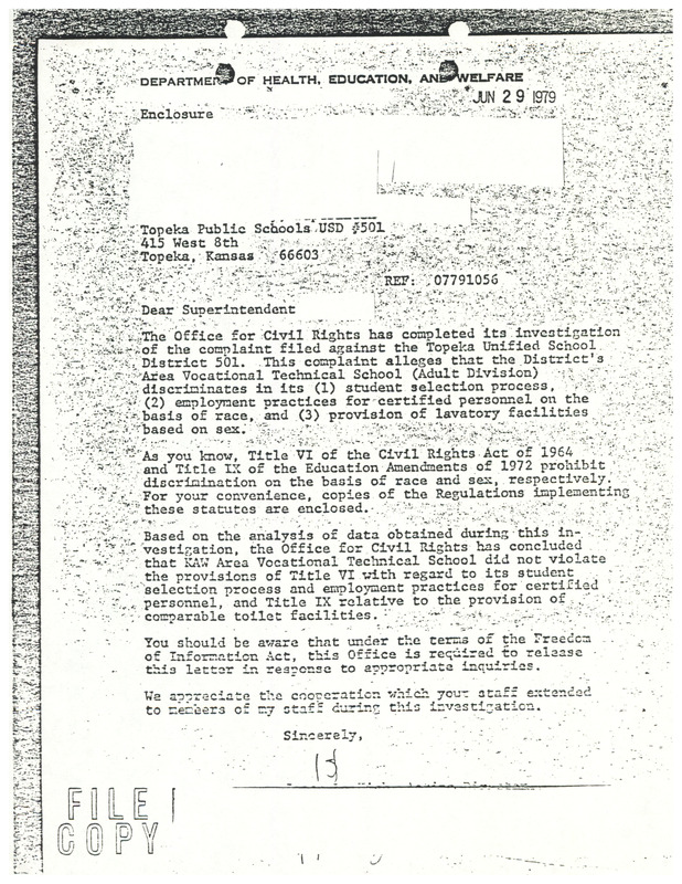 The Office of Civil Rights of the Region VII Department of Health, Education, and Welfare alerts the Topeka Public Schools Superintendent that their analysis shows that the KAW Area Vocational School did not violate the provisions of Title VI of the Civil Rights Act or Title IX of the Education Amendments of 1972. Names have been redacted.