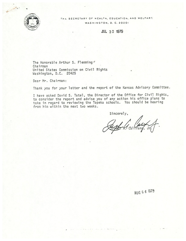 Joseph A. Califano Jr. of the United States Department of Health, Education, and Welfare writes to Chairman of the United States Commission on Civil Rights Arthur S. Flemming to alert him that his office has received his letter and report of the Kansas Advisory Committee and should hear a response within the next two weeks.