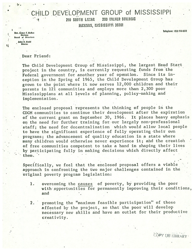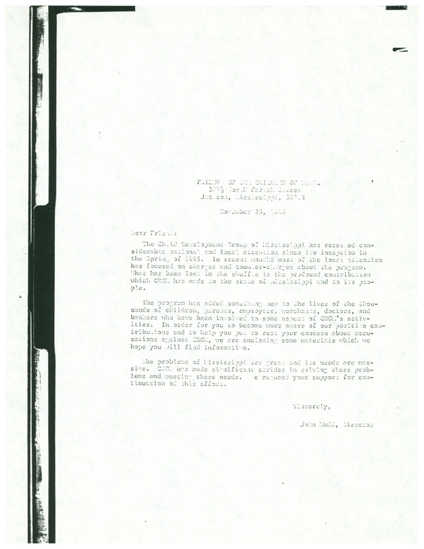 Director of Child Development Group of Mississippi (CDGM) John Mudd writes this letter to supporters of CDGM requesting continued support in the face of accusations of wrongdoing by the organization. Mr. Mudd lists some of the contributions CDGM and Head Start have made to communities in Mississippi.