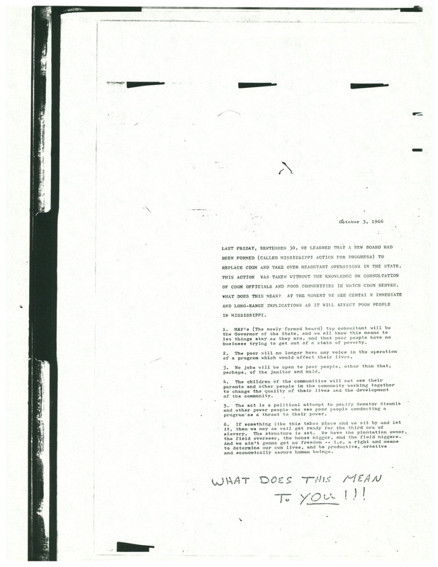 A letter from John Mudd, director of Child Development Group of Mississippi (CDGM) to supporters seeking input on a new funding proposal. The current funding was to expire on September 30, 1966, and CDGM is working to determine how to proceed with acquiring a new round of funding to keep Head Start in Mississippi operating.