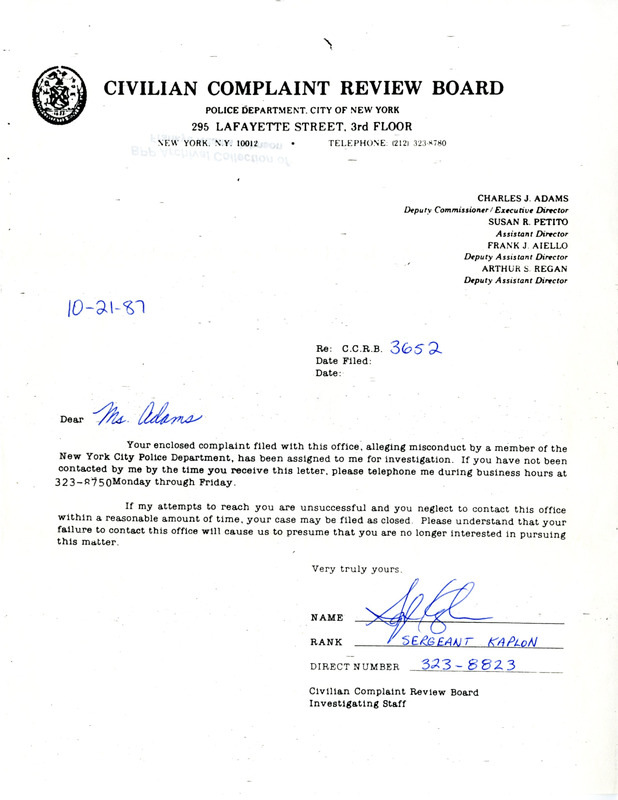 A letter from Sergeant Kaplon of the City of New York Police Department to Frankye Adams-Johnson (Malika) informing her that he will be handling her allegation of misconduct by the police. There is also a copy of the complaint where Frankye Adams-Johnson (Malika) witnessed seeing a police officer assaulting an unknown Black male.