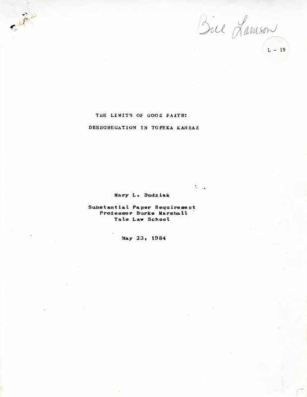 A paper by Yale Law School student Mary Dudziak representing the “current stage of my continuing research on the history of school segregation in Topeka Kansas.” She thanks the ACLU for research and travel funds. Handwritten notes from Lamson throughout the paper and attached sheets with handwritten notes from Lamson.
