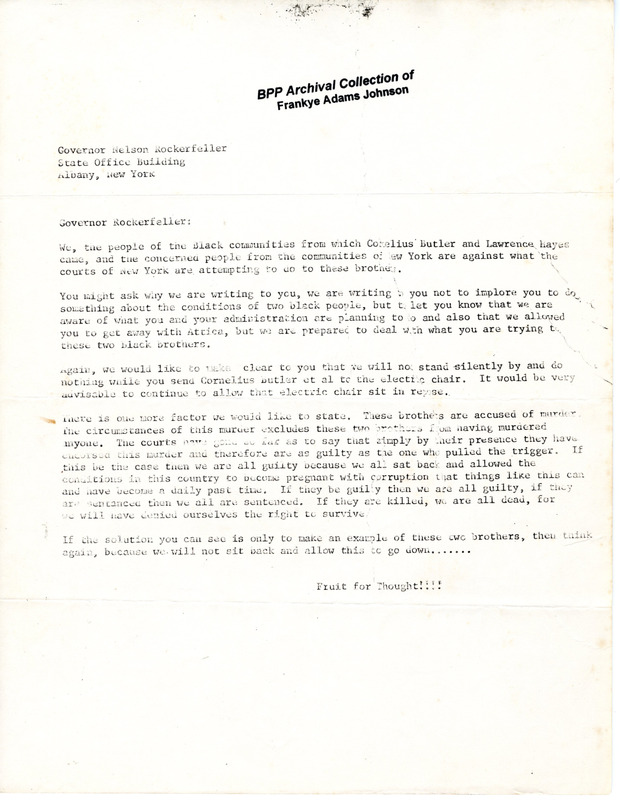 A letter to New York Governor Nelson Rockefeller on behalf of Cornelius Butler and Lawrence Hayes, who were being tried for murder. The men were convicted to the death penalty on April 11, 1972, for their role in the hold-up of a convenience store and the murder of a police officer. Supporters contend that neither of the men fired the shots.