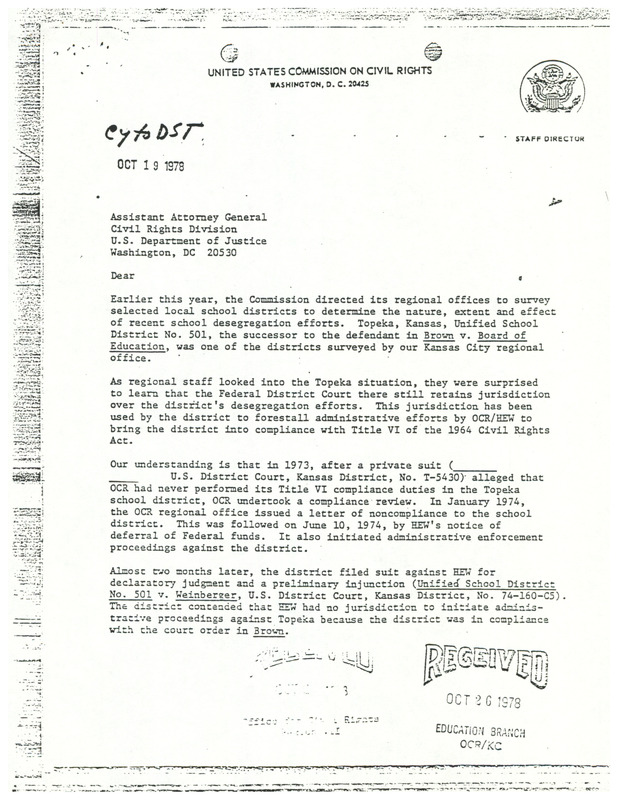 A letter from the Staff Director of the United States Commission on Civil Rights (name redacted) to Assistant Attorney General, Civil Rights Division of the U.S. Department of Justice (name redacted) requesting correspondence on the Topeka desegregation case.