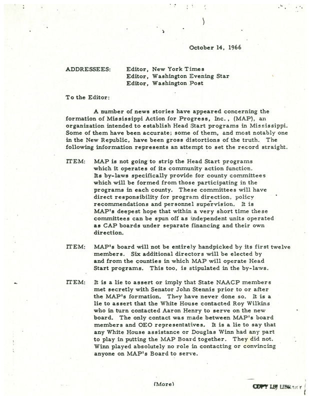 Hodding Carter III, Editor of the Greenville Delta Democrat-Times and board member of Mississippi Action for Progress (MAP), writes to the editors of the New York Times, the Washington Evening Star, and the Washington Post to clear up what he sees as inconsistencies and untruths in reporting about the formation of MAP and its role with Head Start.