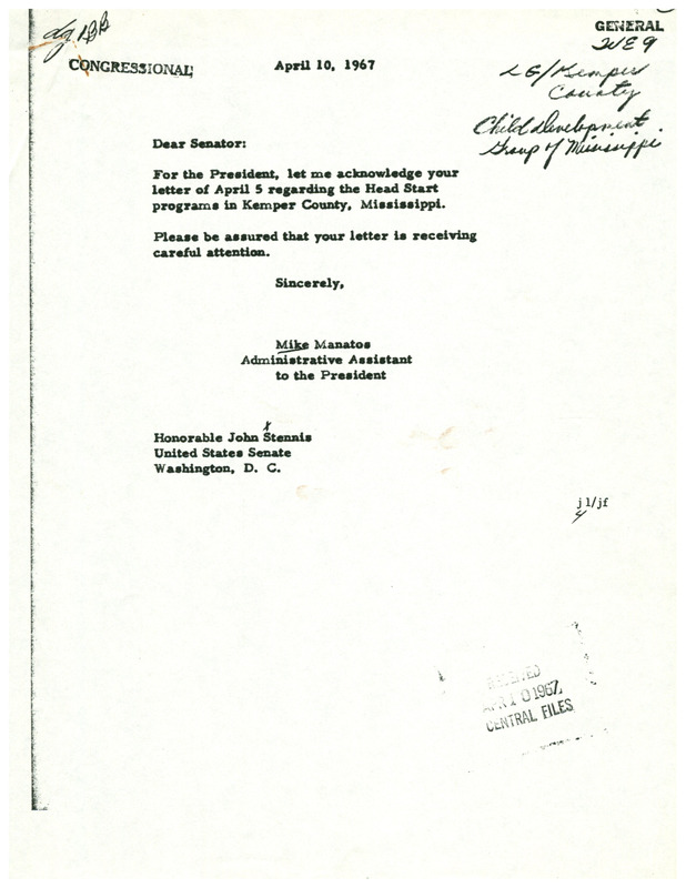 Mike Manatos, Administrative Assistant to President Lyndon Baines Johnson, writes to Senator John Stennis about Head Start in Kemper County, Mississippi. Mr. Manatos writes to acknowledge an April 5th letter from Senator Stennis and assures him the letter is receiving careful attention from the president's office.