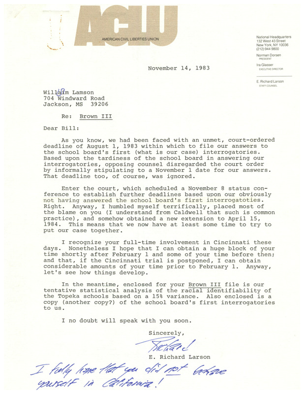 Case Data and Exhibits for Brown III, a relitigation of Brown v. Topeka Board of Education (1954) that corrected resegregation issues caused by open enrollment school choice in 1992. A letter from Richard Larson of the ACLU to William Lamson alerting him that the court has given them an extension to April 15, 1984, to respond to interrogatories.