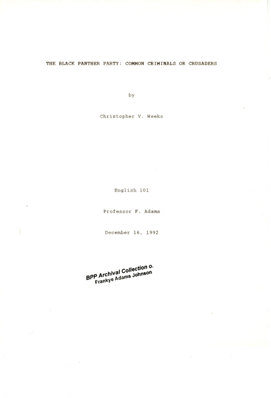 A paper by a student in Frankye Adams-Johnson (Malika)'s English 101 class about the history of the Black Panther Party. The author argues that the members of the Black Panther Party were not born revolutionaries, but were forced into this mind set by the oppressive ways of American society and deemed all of their actions necessary for liberation.