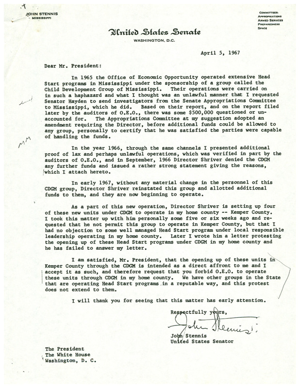 Senator John Stennis writes to President Lyndon Baines Johnson about Head Start in Kemper County, Mississippi. Senator Stennis is requesting that President Johnson forbid the Office of Economic Opportunity (OEO) to operate Head Start units through Child Development Group of Mississippi (CDGM) in his home county.