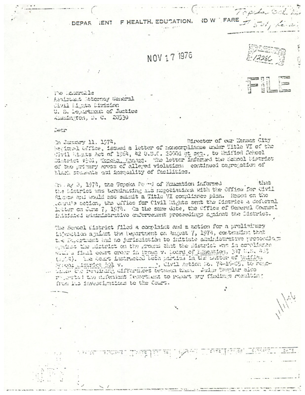 A letter from the Department of Health Education and Welfare (name redacted) to Assistant Attorney General, Civil Rights Division of the U.S. Department of Justice (name redacted) about details involved in the Topeka desegregation case.