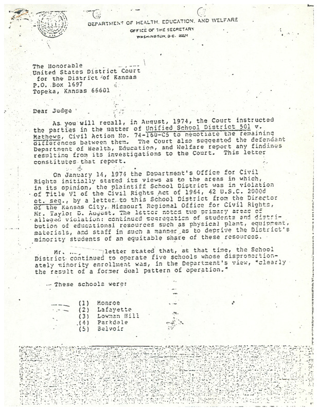 The Director of the Office for Civil Rights in the United States Department of Health, Education, and Welfare (name redacted) writes to U.S. District Court Judge (name redacted) about their concern that the desegregation efforts made by the Topeka School System are not acceptable under the requirements of Title VI in the Civil Rights Act of 1964.